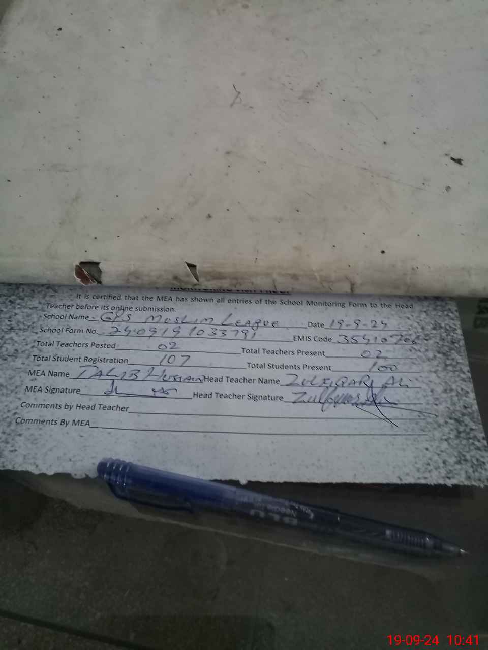 | Certified that this School was Inspected by the Undersigned MEA/DMO Today and the Information Stated Above is as Per Record. | |||||