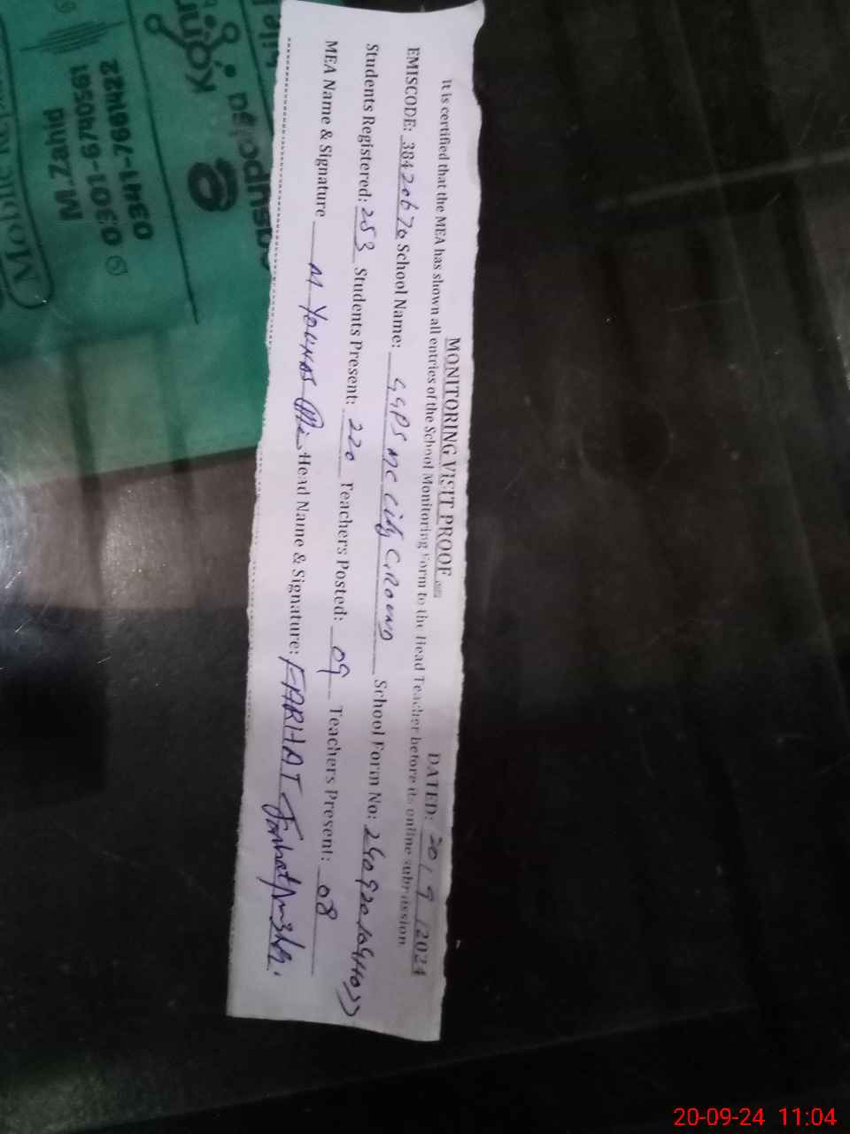 | Attendance Register | Head Teacher | MEA with School | Visit Proof |