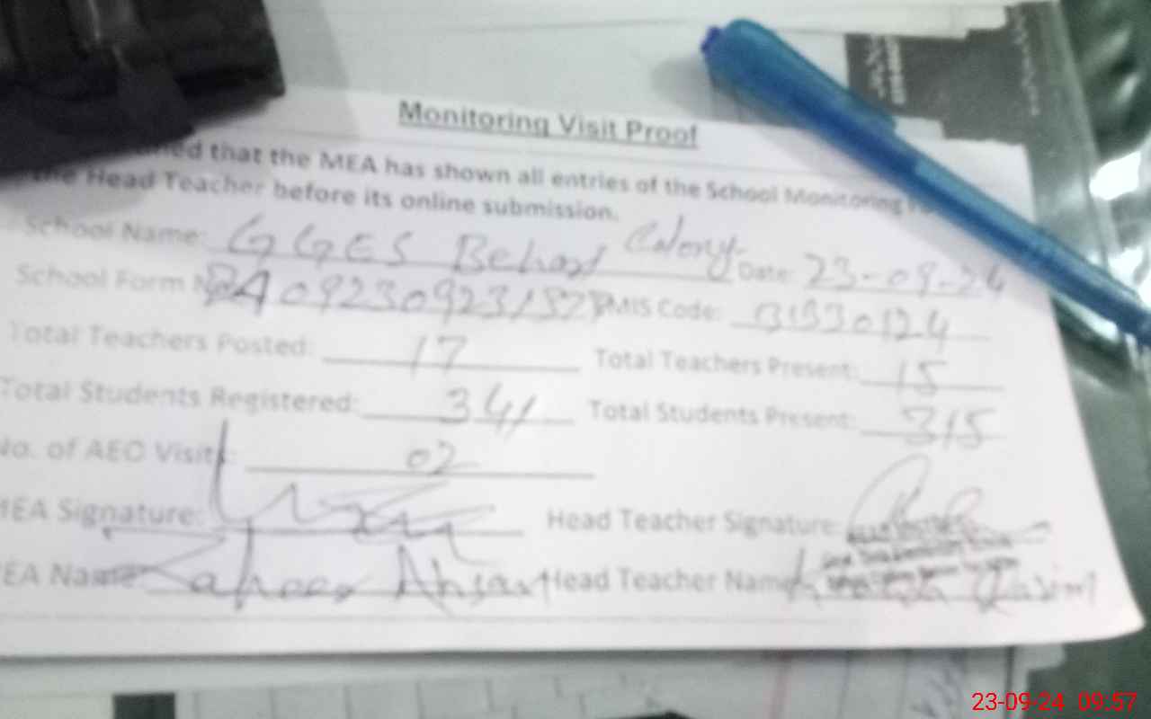 | Monitoring Date: 23-09-2024 | Start Time: 23-09-2024 08:58 AM | End Time: 23-09-2024 10:01 AM | Name of MEA: Za**** Ah**** | |