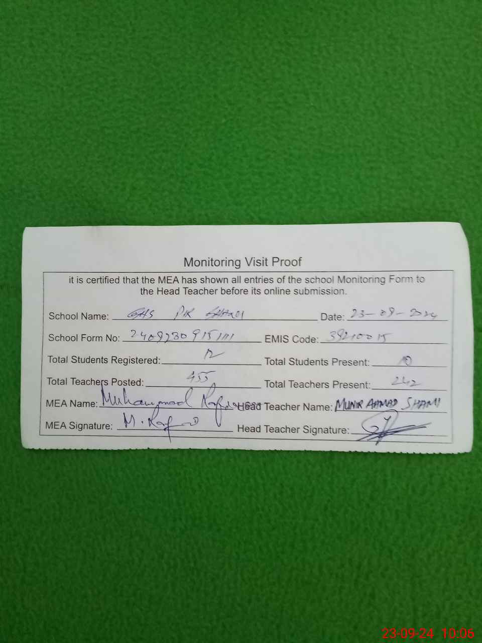 | Certified that this School was Inspected by the Undersigned MEA/DMO Today and the Information Stated Above is as Per Record. | |||||