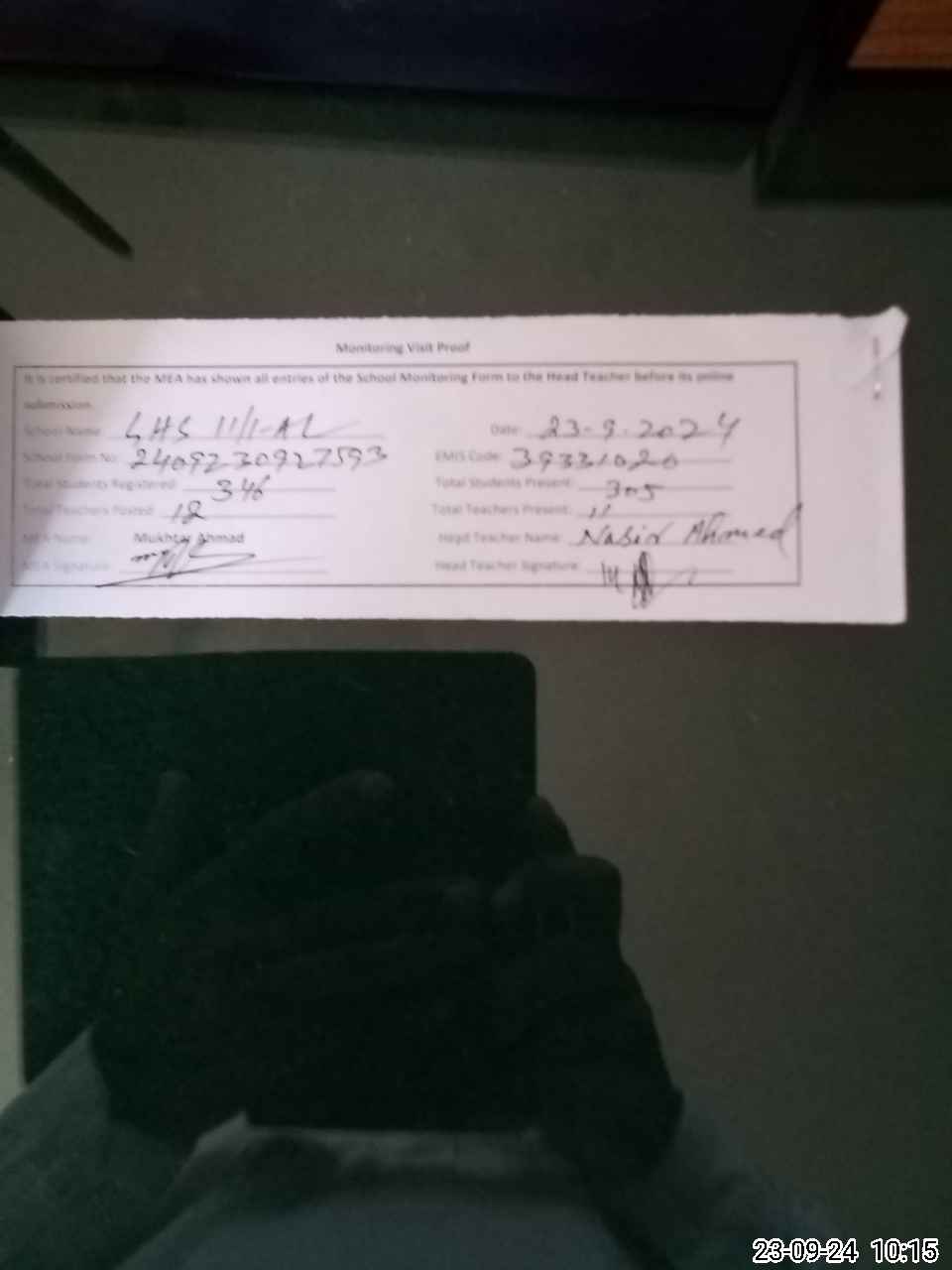 | Attendance Register | Head Teacher | MEA with School | Visit Proof |