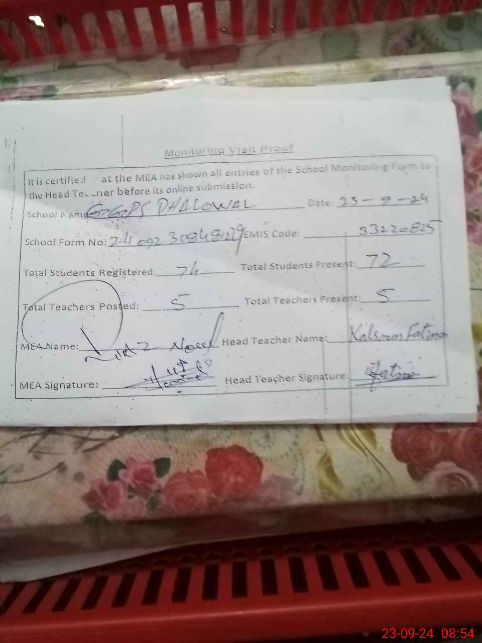 | Attendance Register | Head Teacher | MEA with School | Visit Proof |