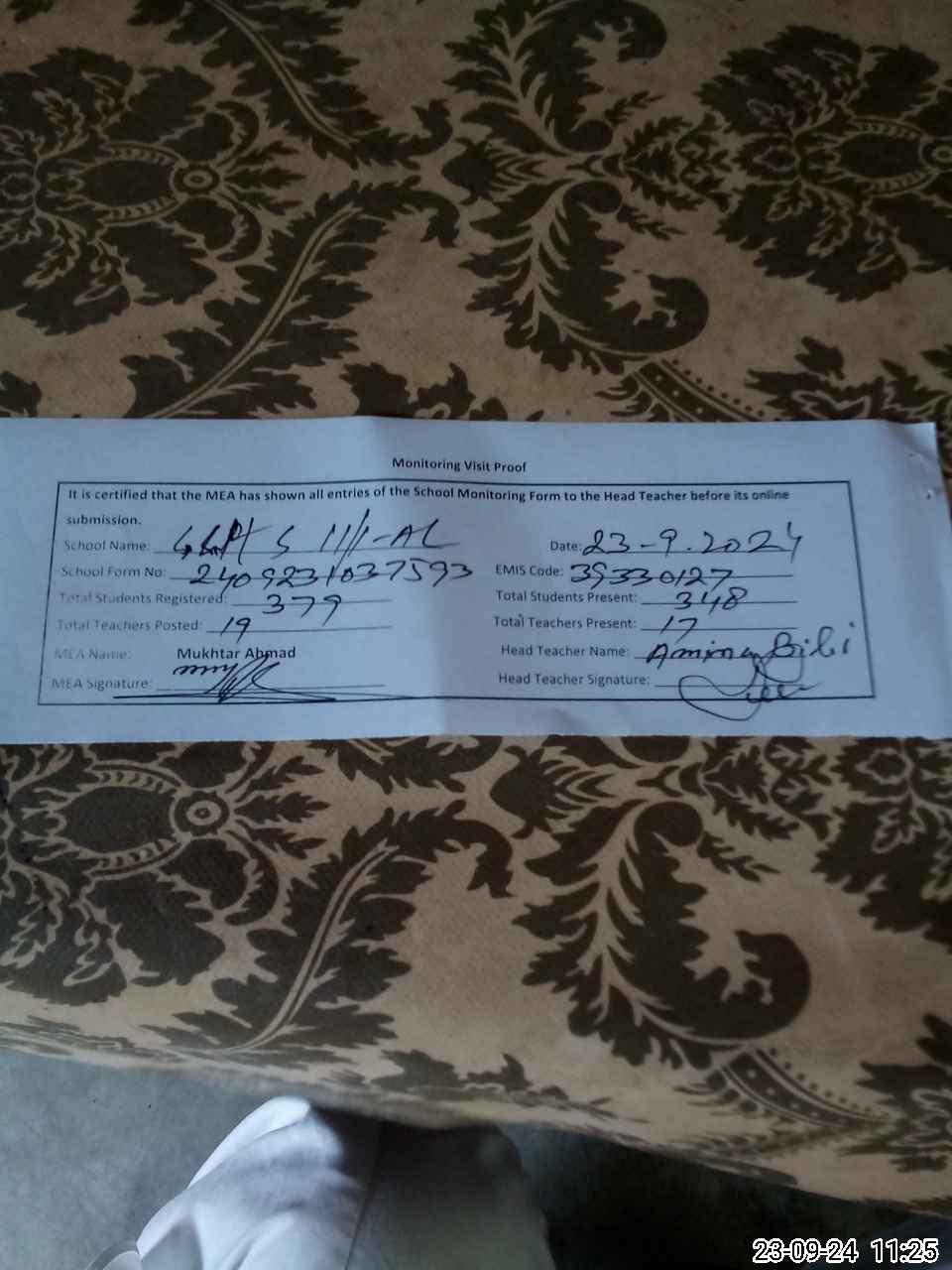 | Certified that this School was Inspected by the Undersigned MEA/DMO Today and the Information Stated Above is as Per Record. | |||||