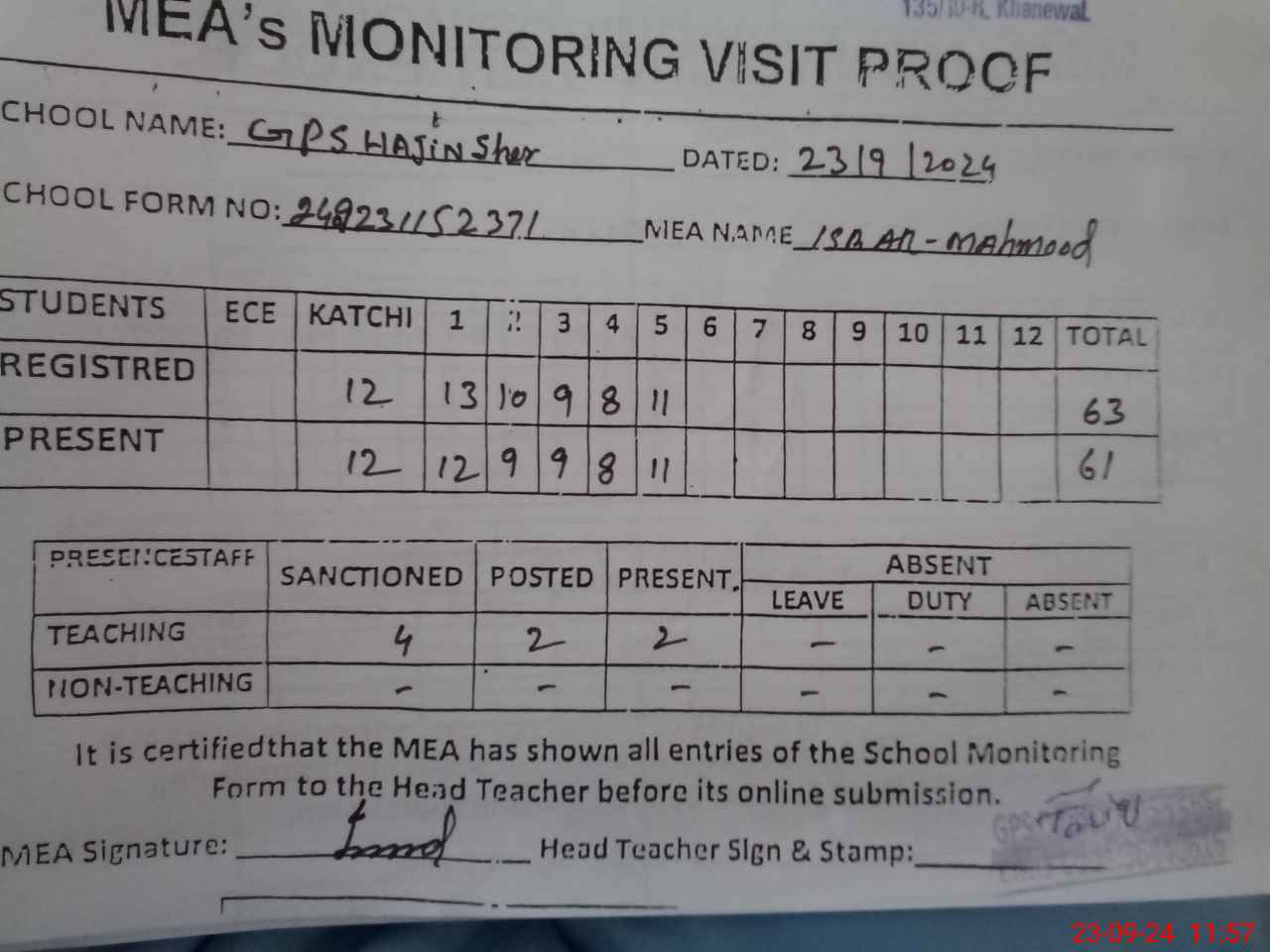 | Attendance Register | Head Teacher | MEA with School | Visit Proof |