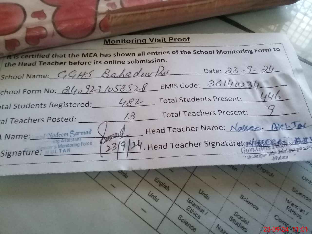 | Attendance Register | Head Teacher | MEA with School | Visit Proof |