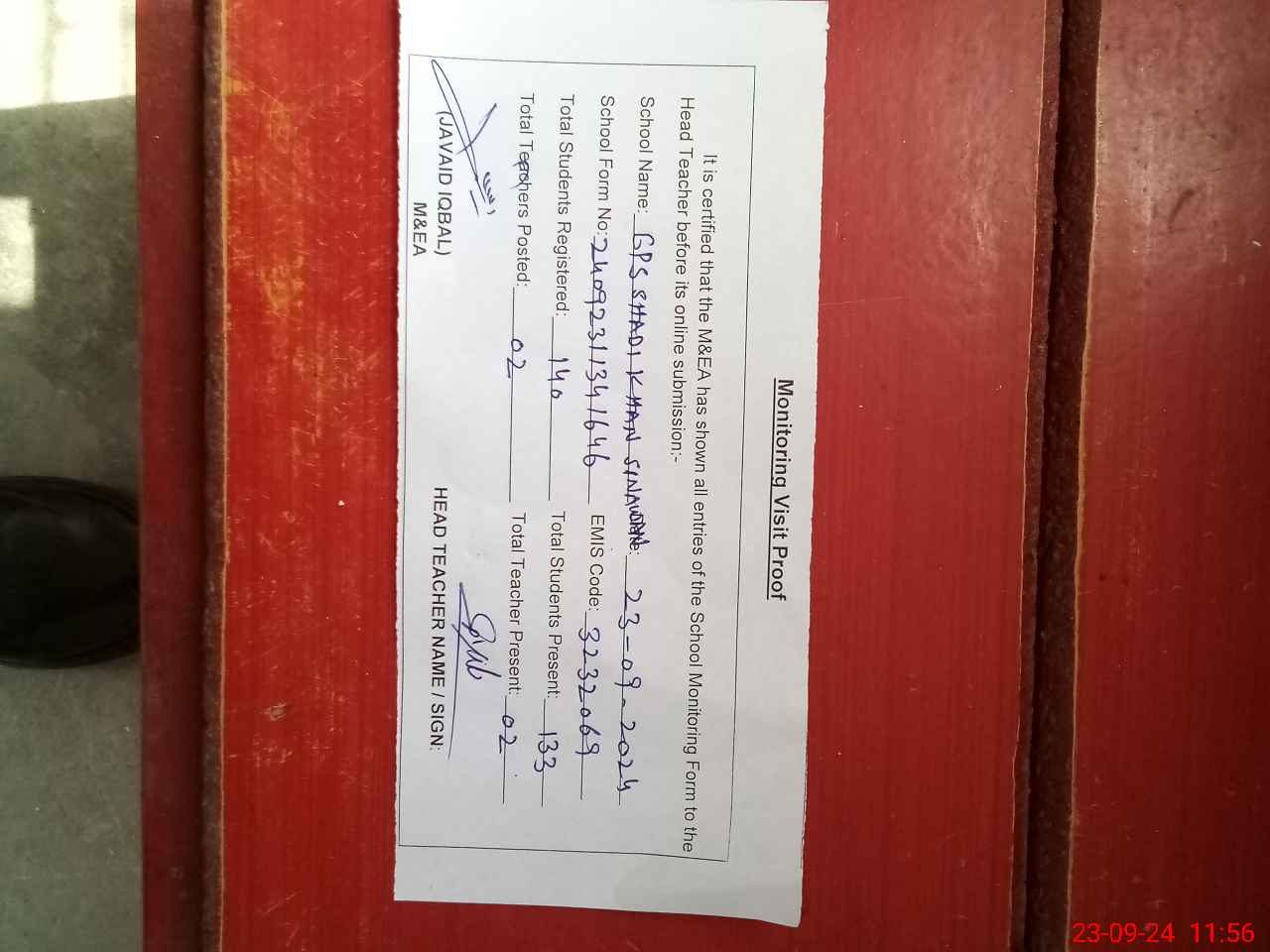 | Attendance Register | Head Teacher | MEA with School | Visit Proof |