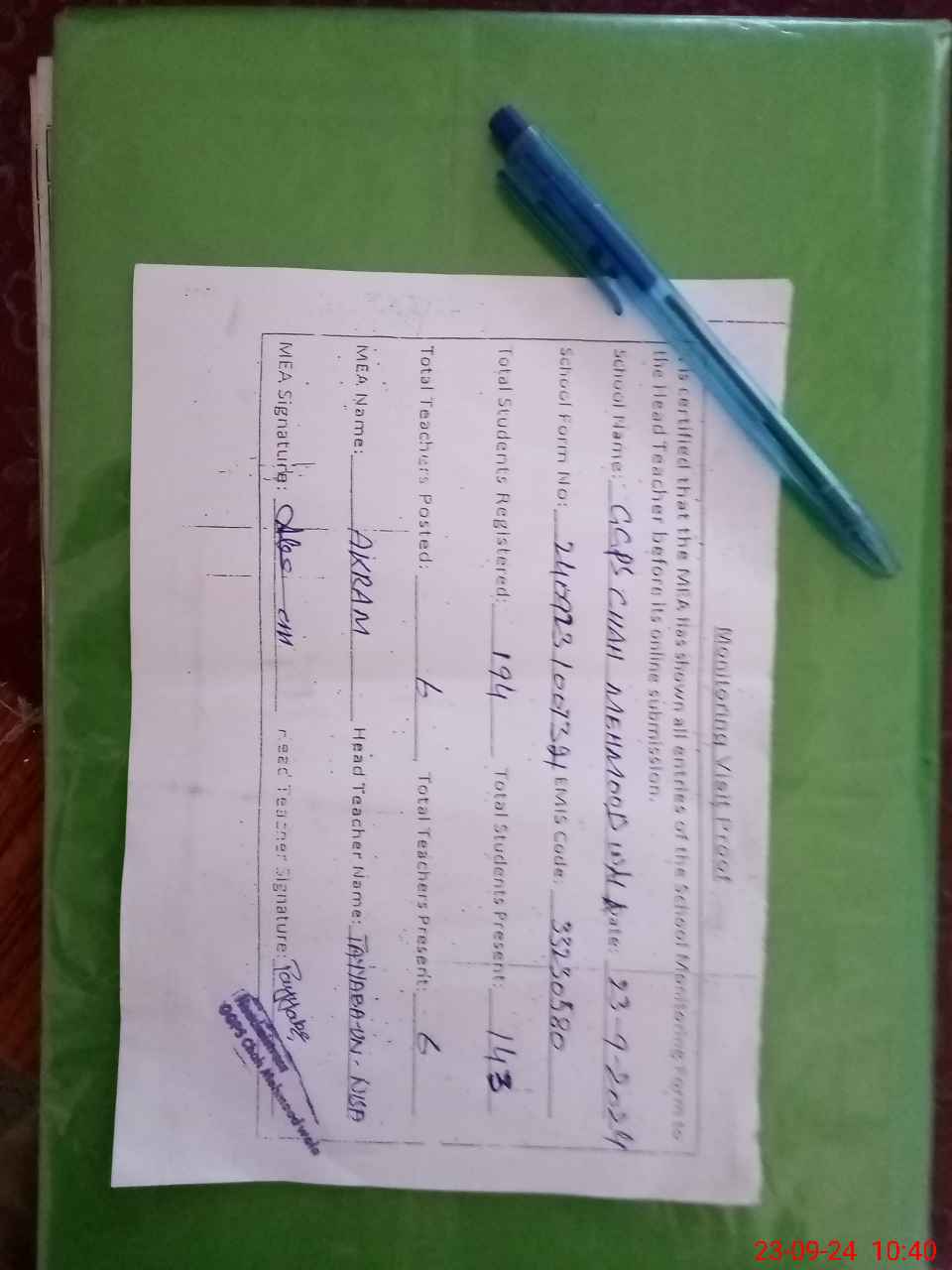 | Attendance Register | Head Teacher | MEA with School | Visit Proof |
