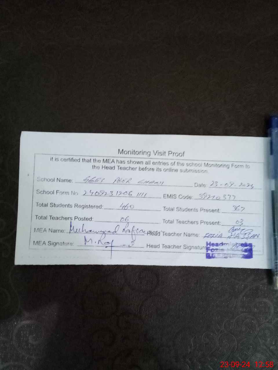 | Attendance Register | Head Teacher | MEA with School | Visit Proof |