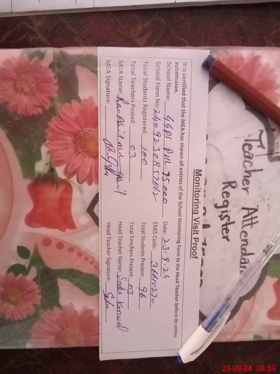 | Attendance Register | Head Teacher | MEA with School | Visit Proof |