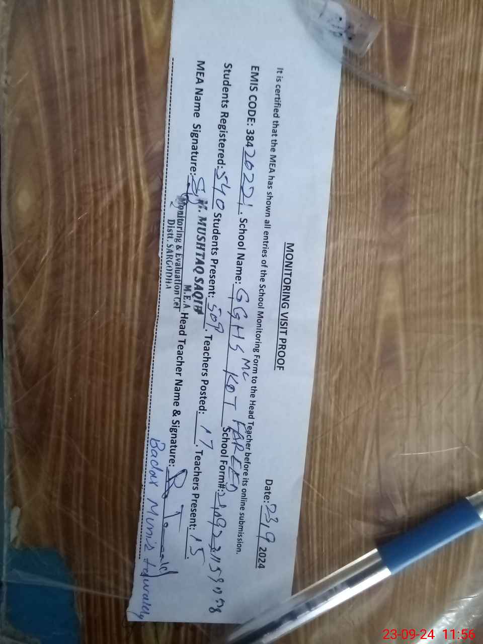 | Attendance Register | Head Teacher | MEA with School | Visit Proof |