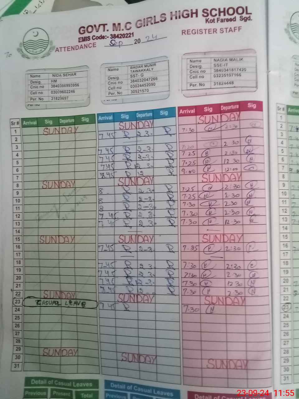| CNIC | Full Name | Designation | R/C | Absence during last cal. month |