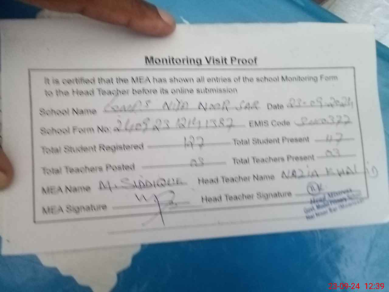 | Attendance Register | Head Teacher | MEA with School | Visit Proof |