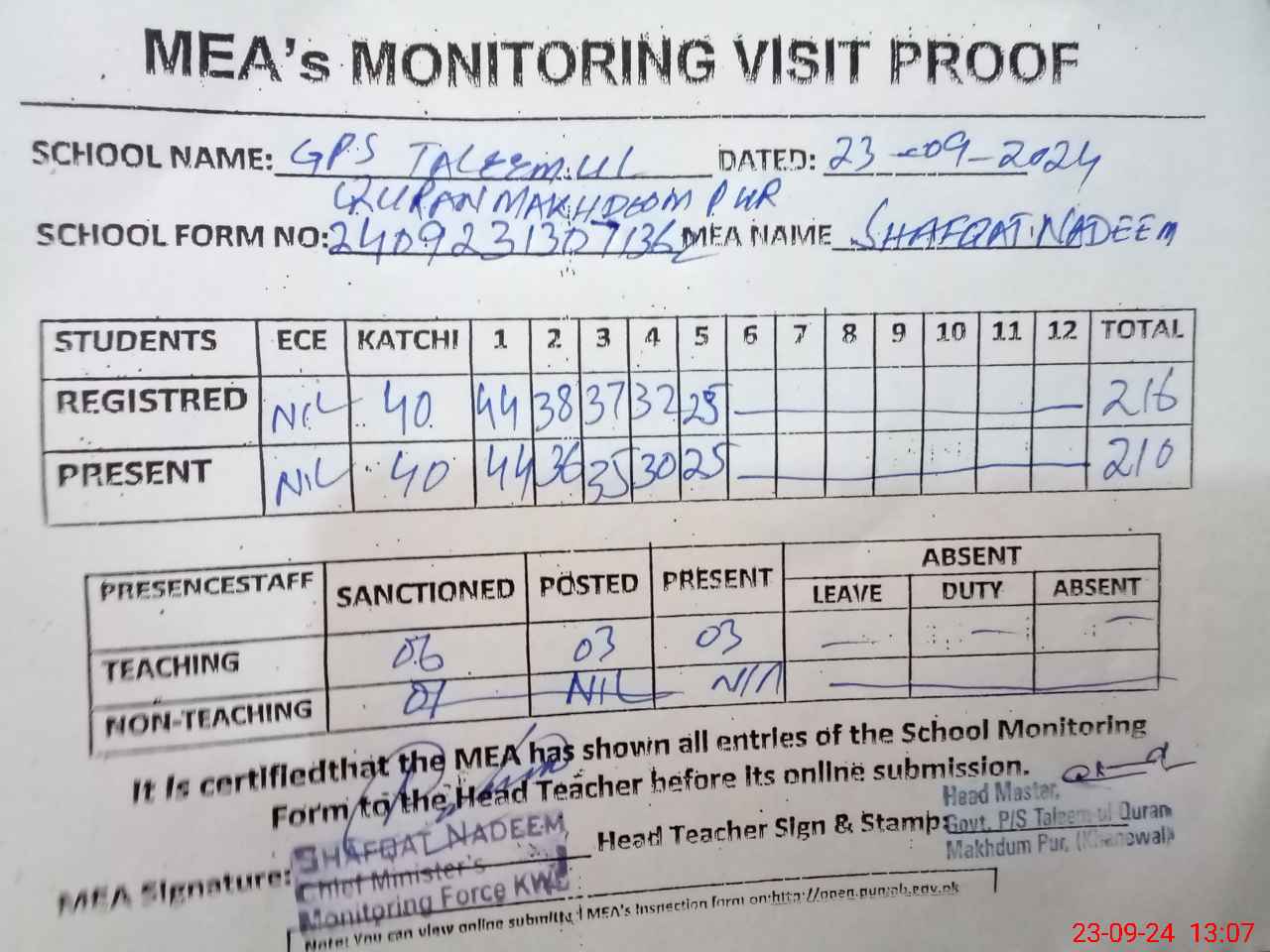 | Attendance Register | Head Teacher | MEA with School | Visit Proof |