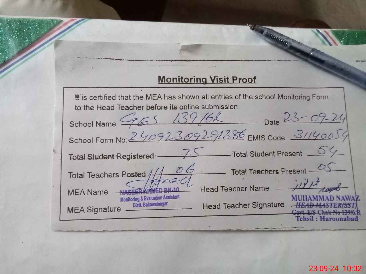 | Attendance Register | Head Teacher | MEA with School | Visit Proof |