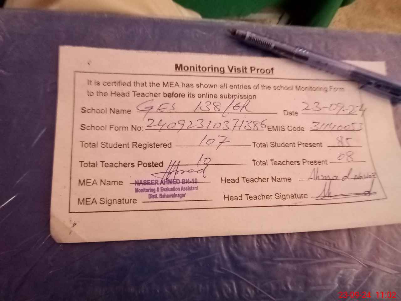 | Attendance Register | Head Teacher | MEA with School | Visit Proof |