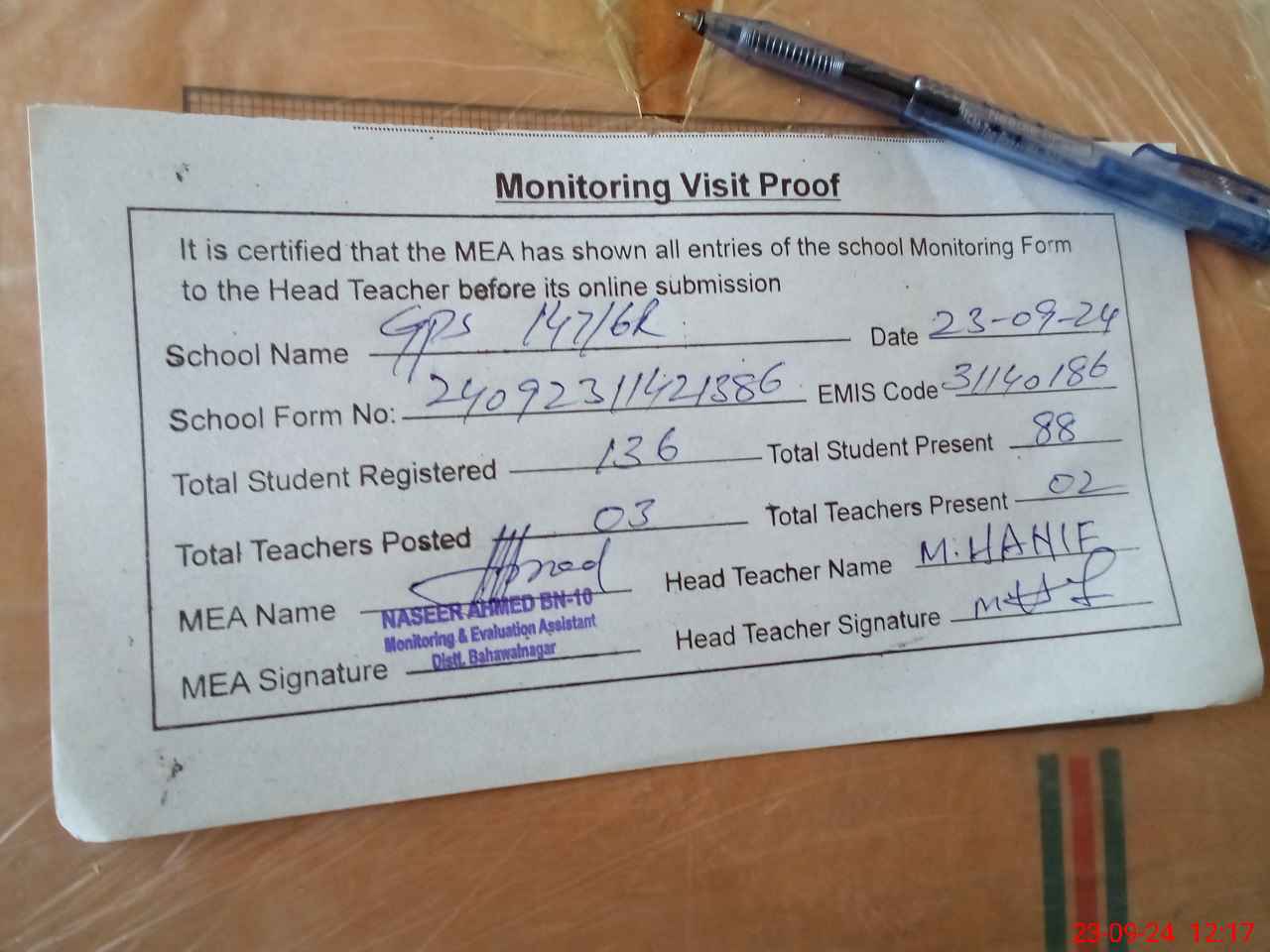 | EMIS Code: 31140186 | Name of School: GPS CHAK NO. 147/6-R | |||