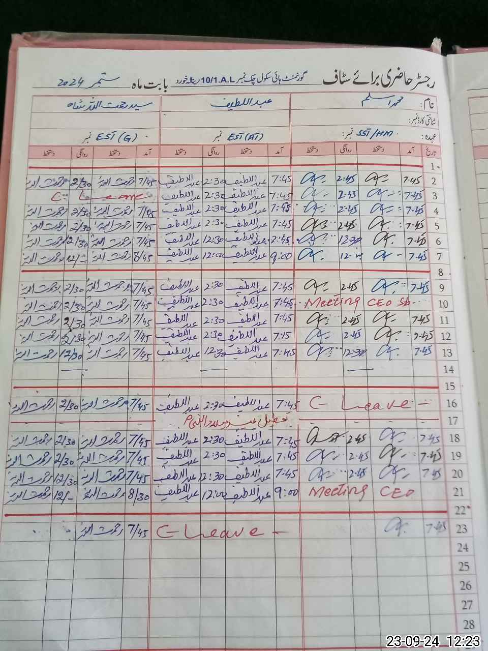 | CNIC | Full Name | Designation | R/C | Absence During Last Calender Month |