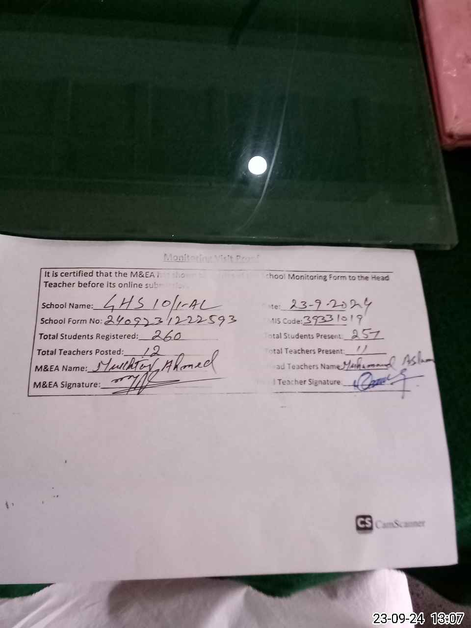 | Attendance Register | Head Teacher | MEA with School | Visit Proof |