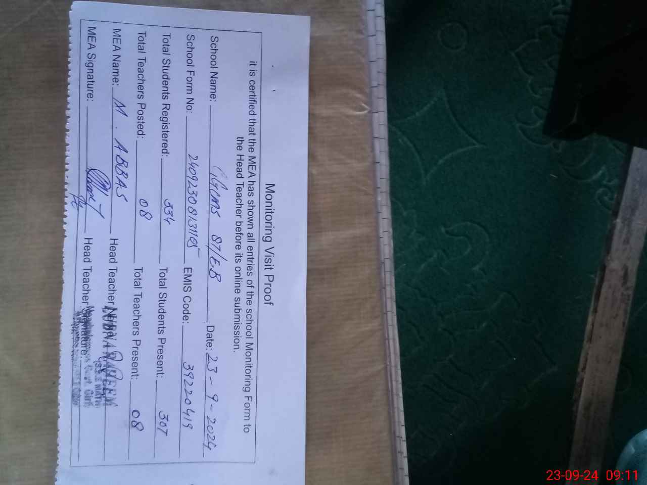 | Certified that this School was Inspected by the Undersigned MEA/DMO Today and the Information Stated Above is as Per Record. | |||||