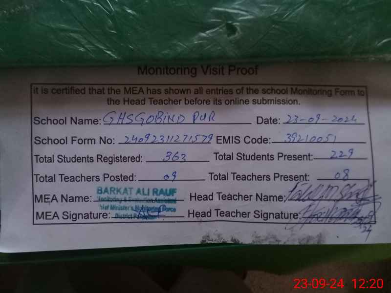 | EMIS Code: 39210051 | Name of School: GHS GOBIND PUR P/O GOBIND PUR | |||