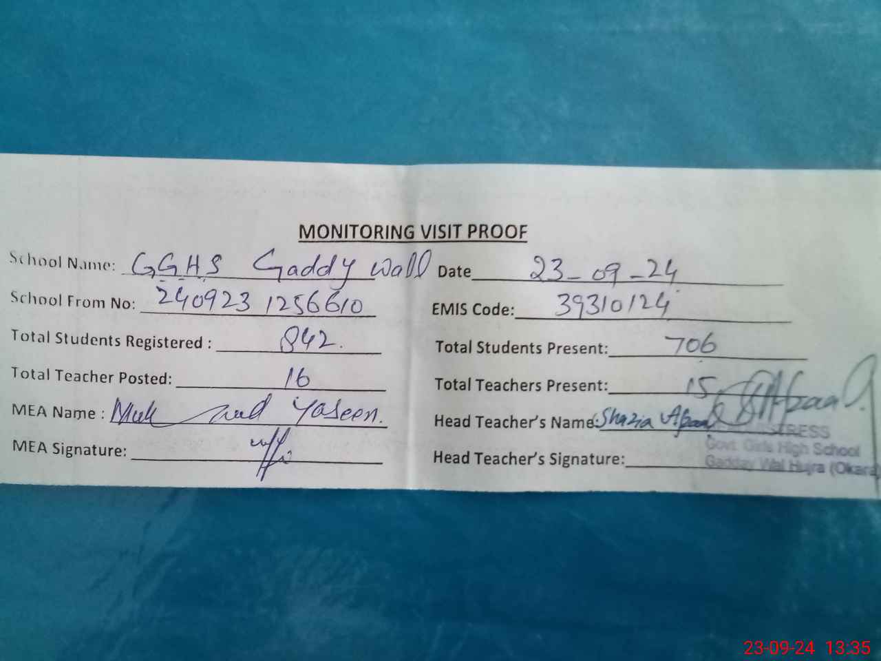 | Attendance Register | Head Teacher | MEA with School | Visit Proof |