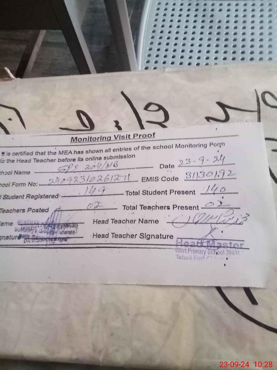 | Attendance Register | Head Teacher | MEA with School | Visit Proof |