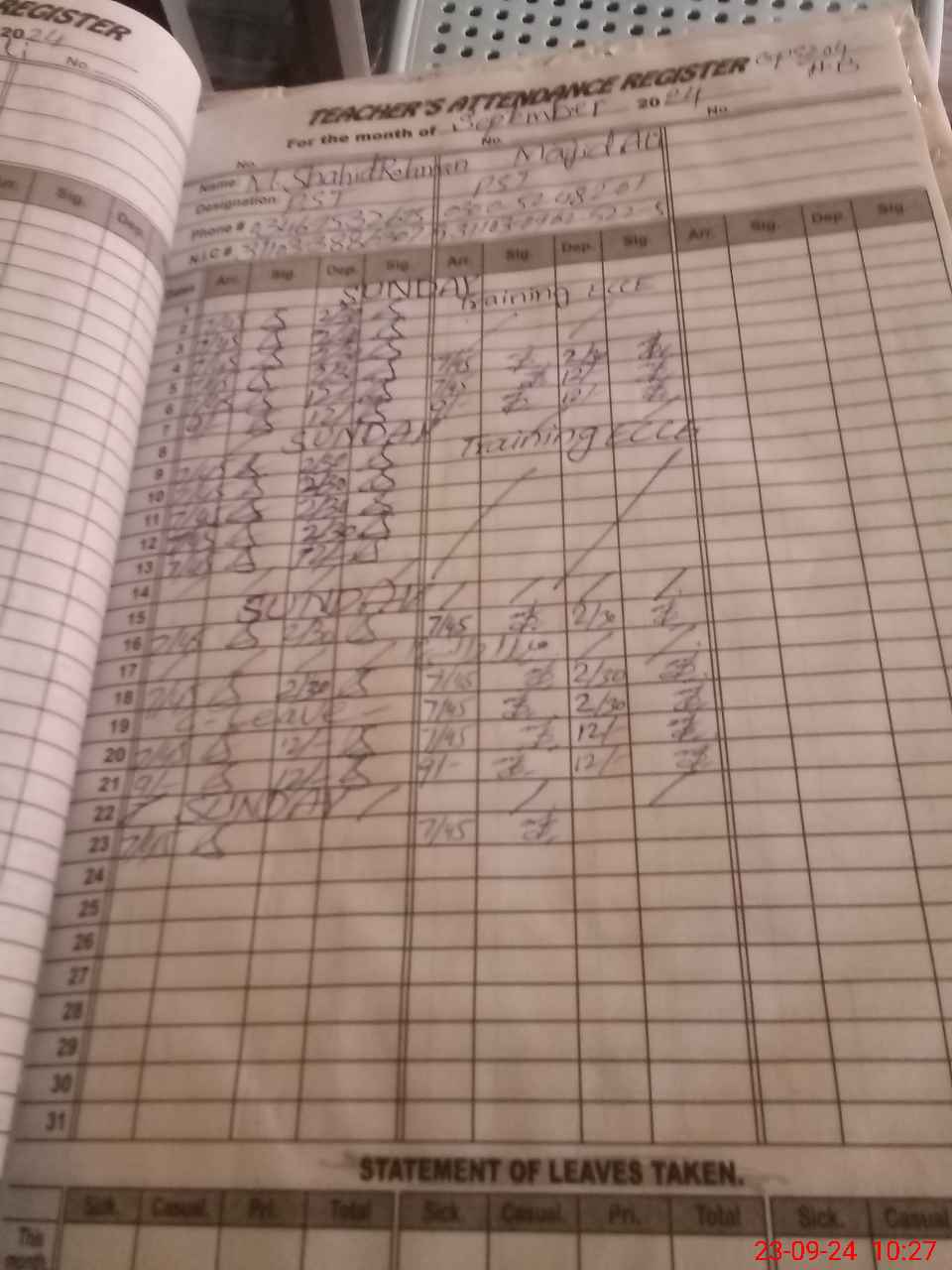 | CNIC | Full Name | Designation | R/C | Absence During Last Calender Month |