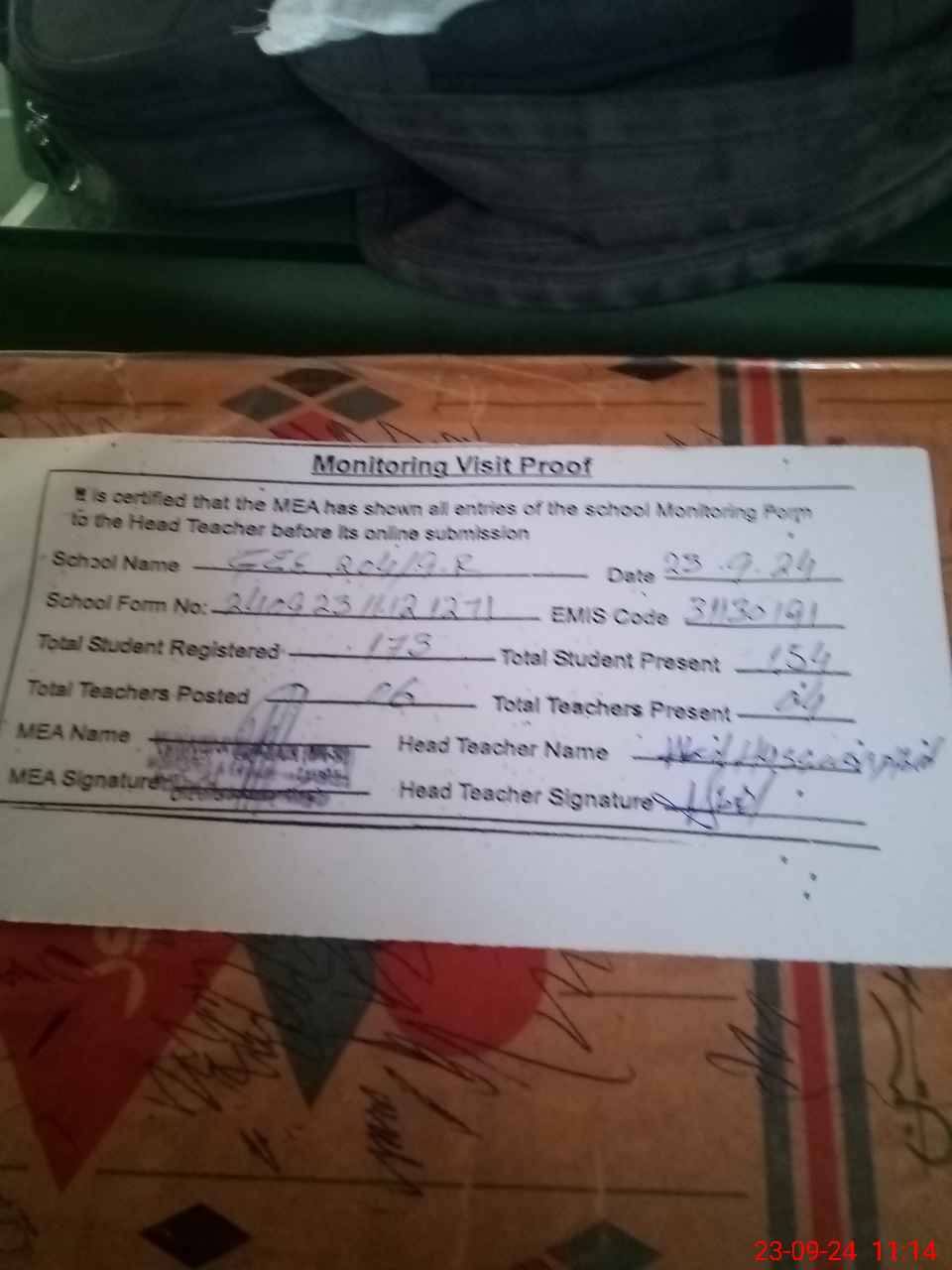 | Attendance Register | Head Teacher | MEA with School | Visit Proof |