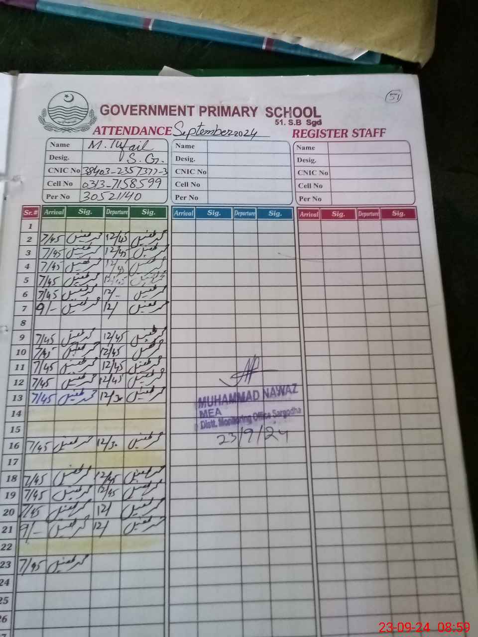 | Name: UM**** FA**** Designation: (School Headmaster's/Headmistress's) PST Phone/Cell Number: 03**** |