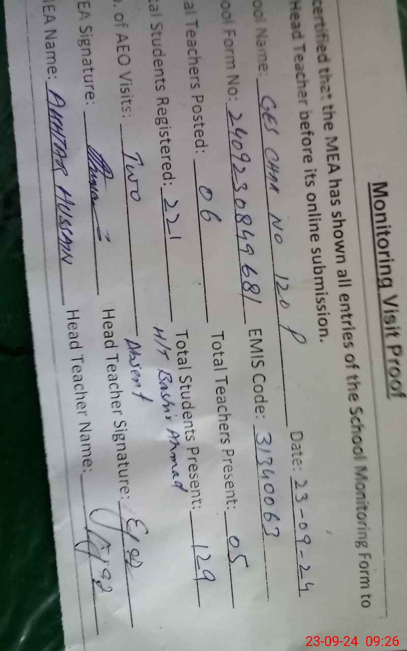 | Attendance Register | Head Teacher | MEA with School | Visit Proof |