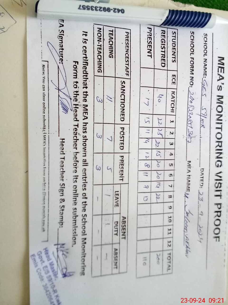 | Attendance Register | Head Teacher | MEA with School | Visit Proof |