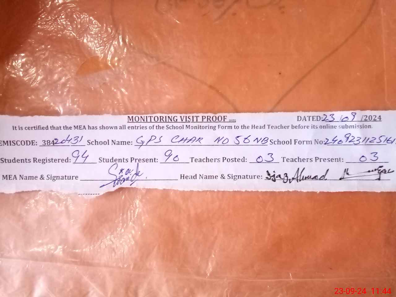 | Attendance Register | Head Teacher | MEA with School | Visit Proof |