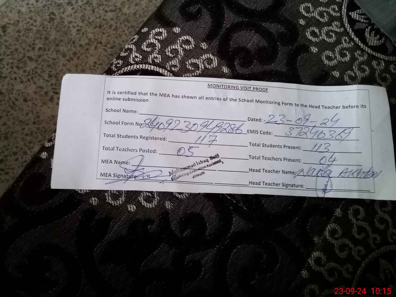 | Monitoring Date: 23-09-2024 | Start Time: 23-09-2024 09:49 AM | End Time: 23-09-2024 10:25 AM | Name of MEA: Mu**** Is**** bu**** | |