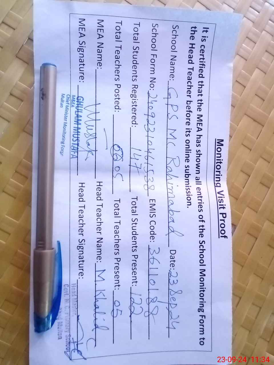 | Attendance Register | Head Teacher | MEA with School | Visit Proof |