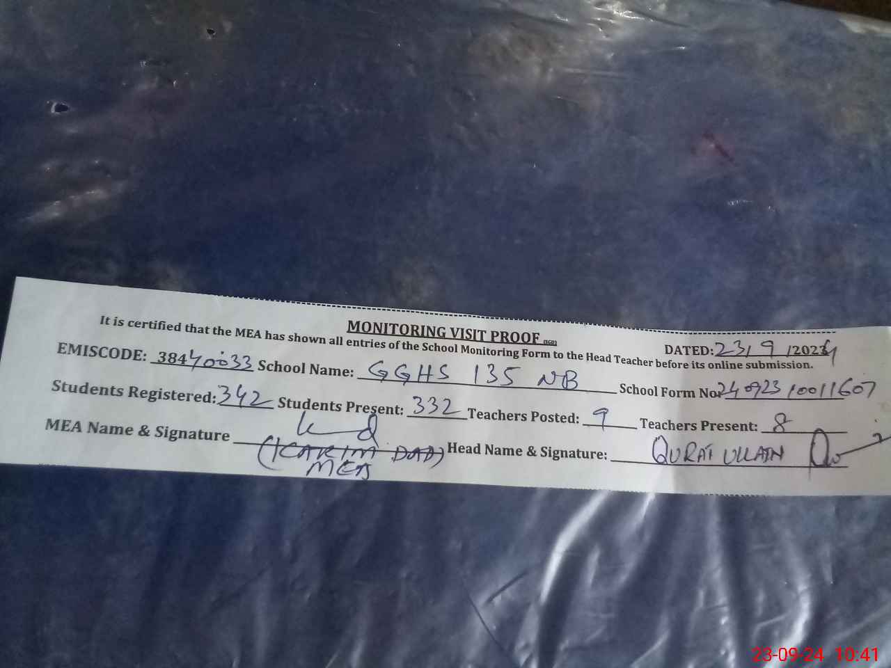 | Attendance Register | Head Teacher | MEA with School | Visit Proof |