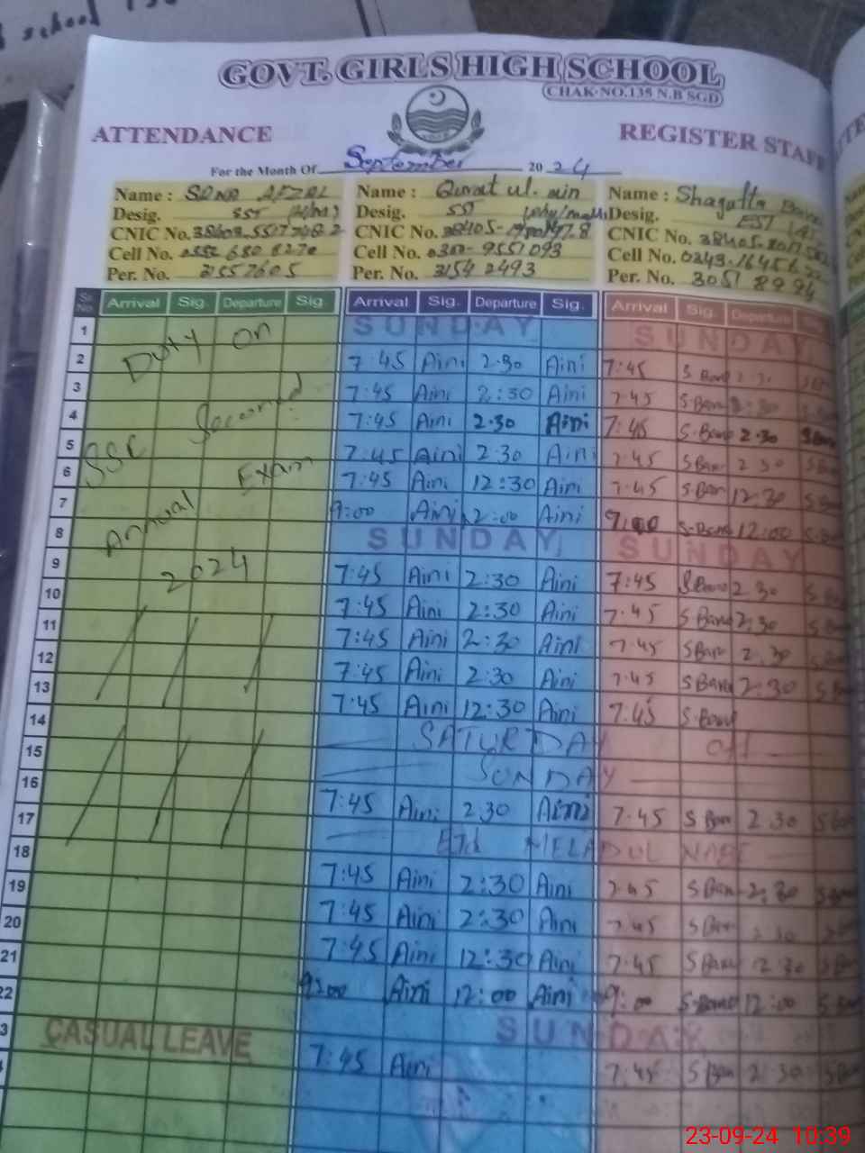 | Name: Sa**** Af**** Designation: (School Headmaster's/Headmistress's) SST (SCI) Phone/Cell Number: 03**** |