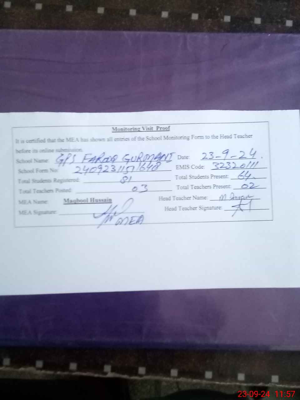 | Attendance Register | Head Teacher | MEA with School | Visit Proof |
