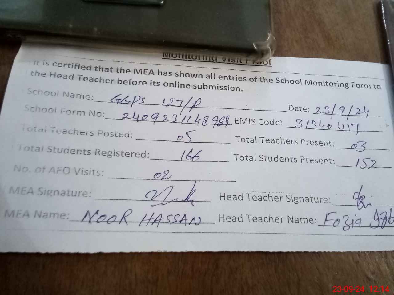 | Attendance Register | Head Teacher | MEA with School | Visit Proof |