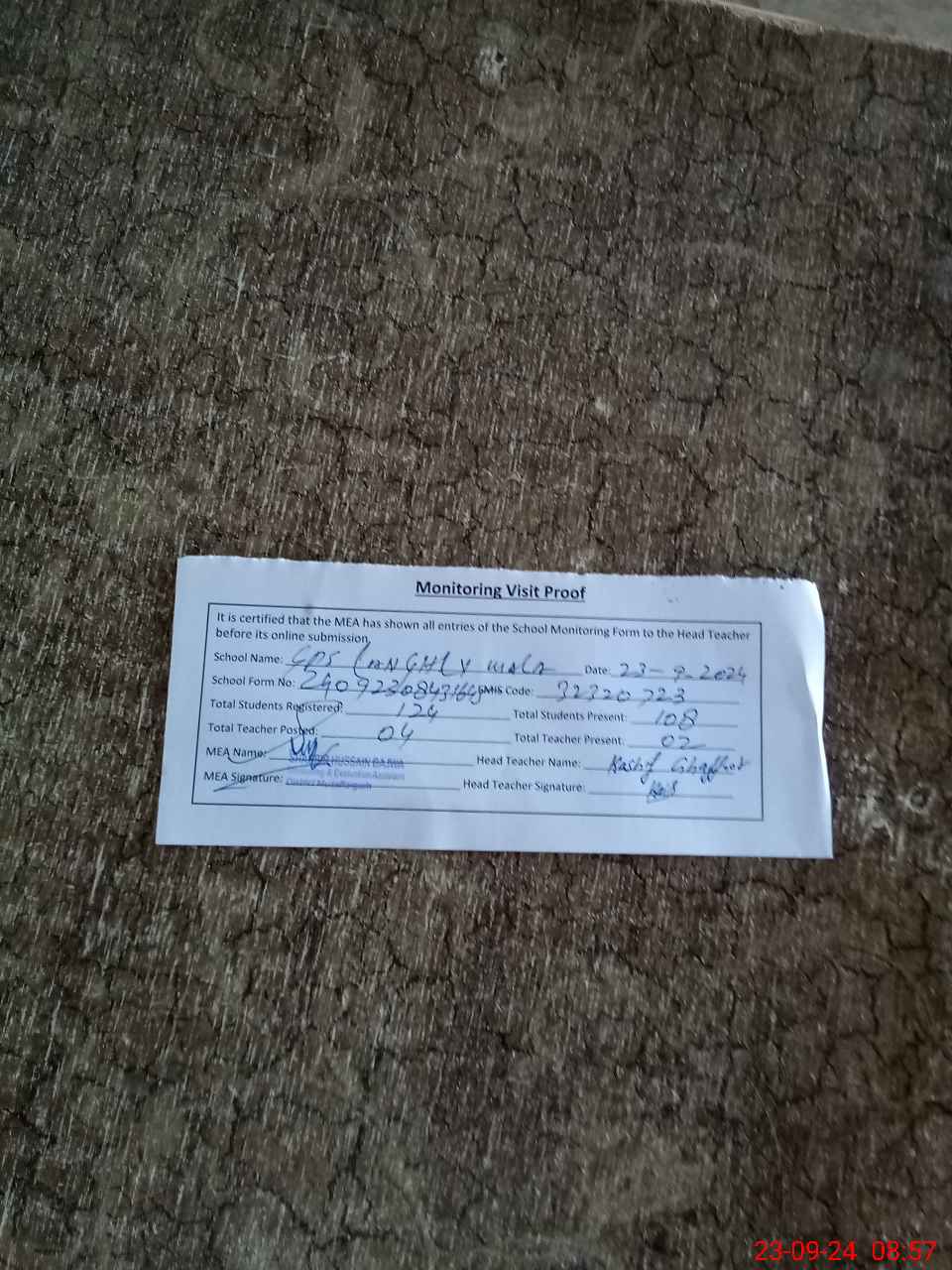 | Attendance Register | Head Teacher | MEA with School | Visit Proof |