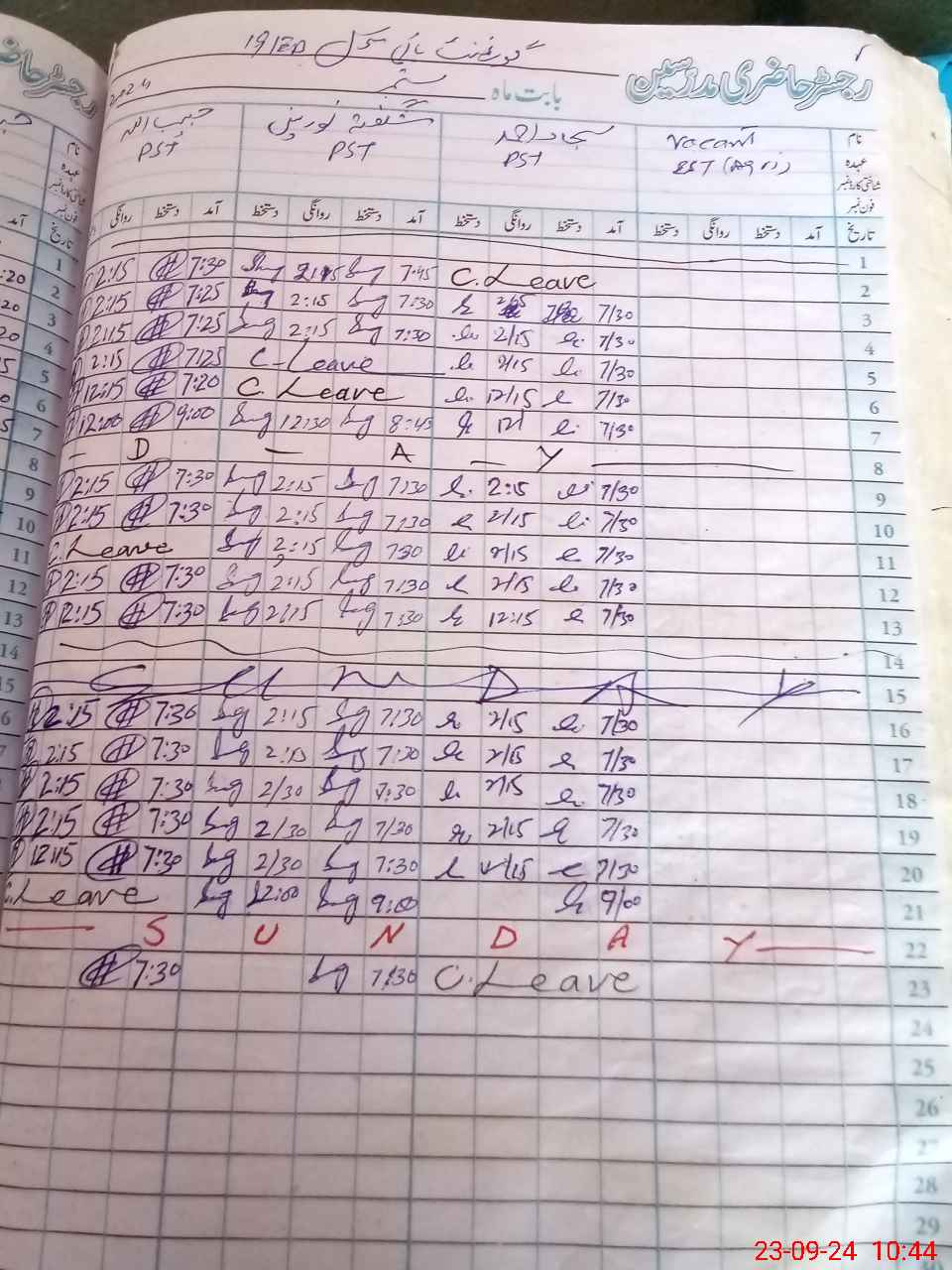 | CNIC | Full Name | Designation | R/C | Absence During Last Calender Month |