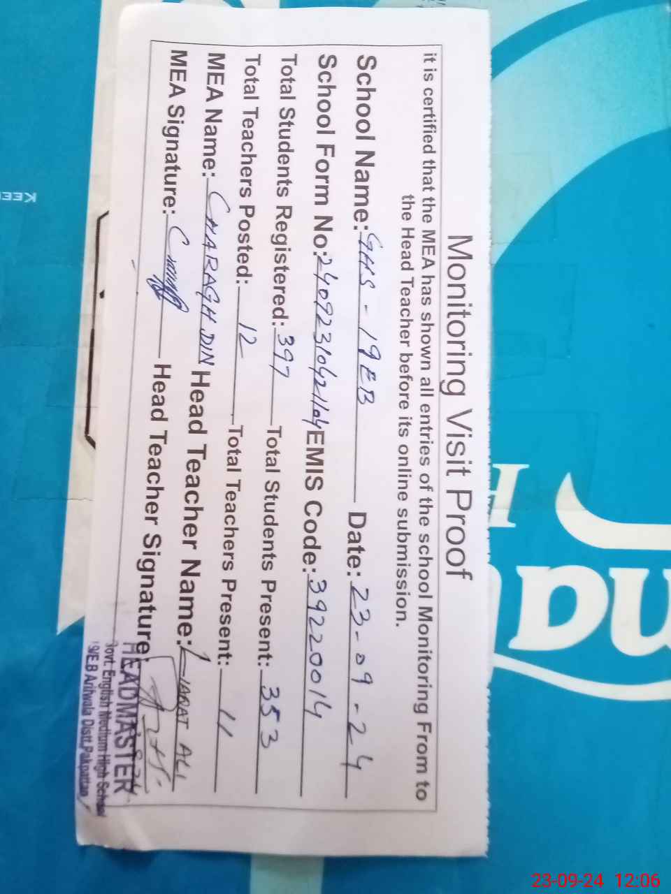 | Attendance Register | Head Teacher | MEA with School | Visit Proof |
