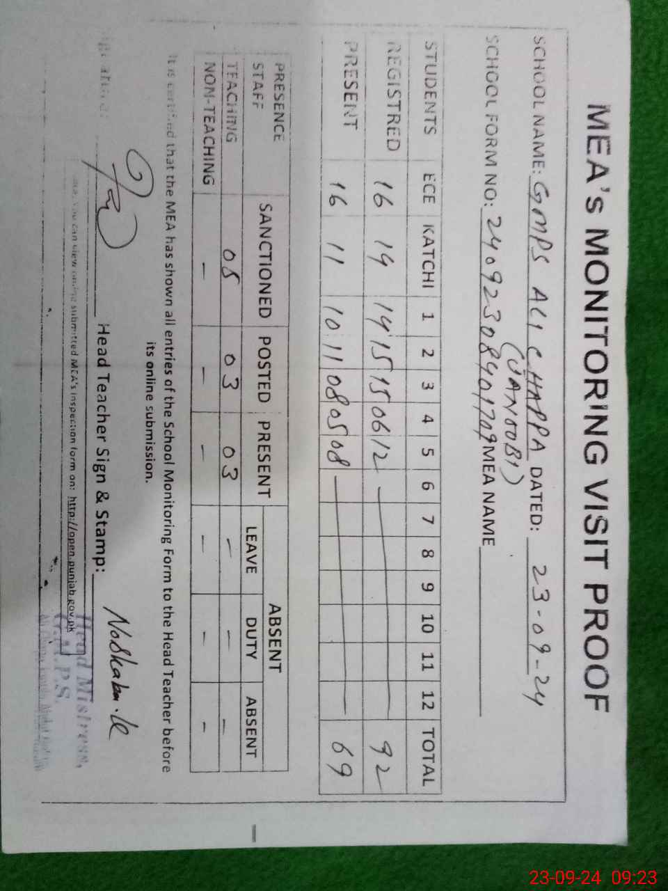| Attendance Register | Head Teacher | MEA with School | Visit Proof |