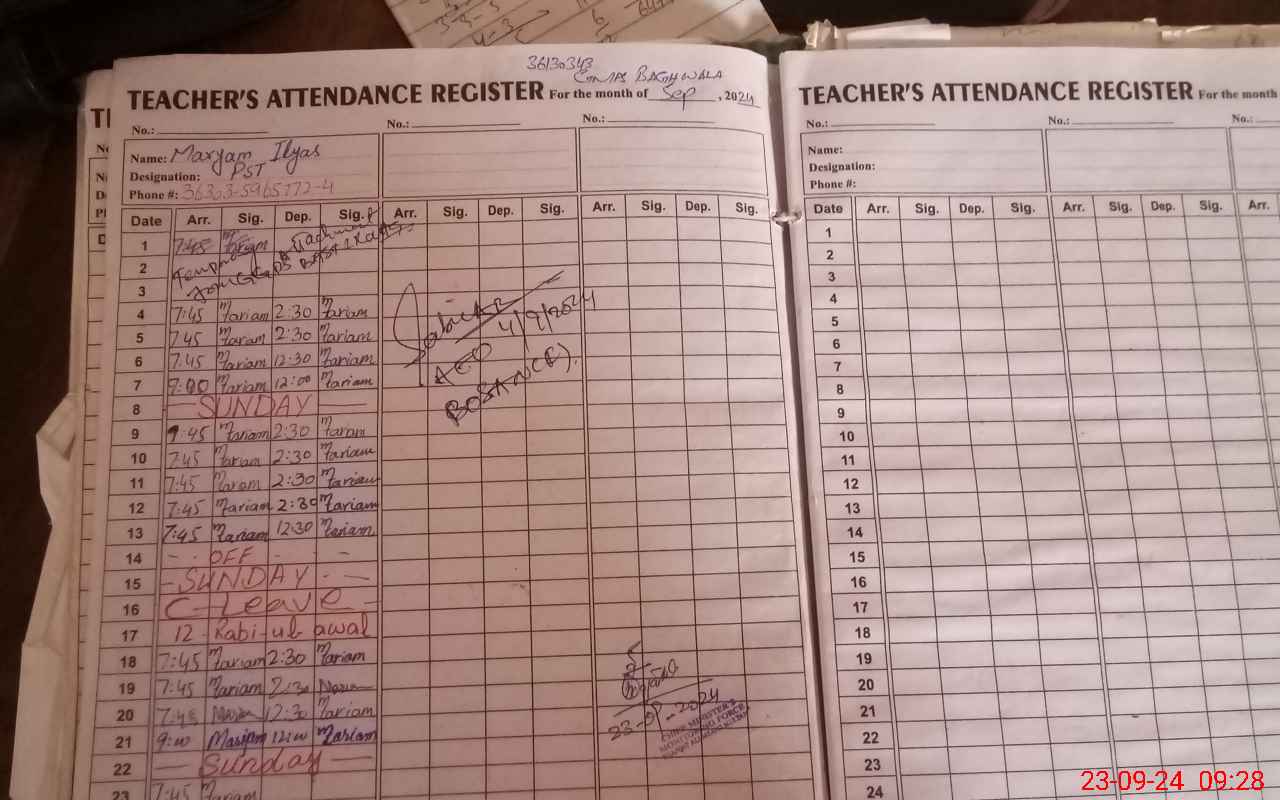 | Name: ZA**** ZA**** Designation: (School Headmaster's/Headmistress's) INCHARGE Phone/Cell Number: 03**** |