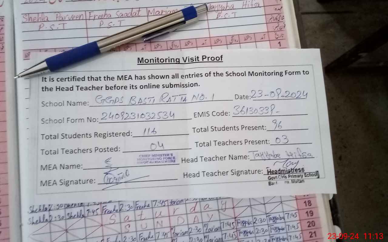 | Monitoring Date: 23-09-2024 | Start Time: 23-09-2024 10:32 AM | End Time: 23-09-2024 11:14 AM | Name of MEA: SH**** AL**** | |