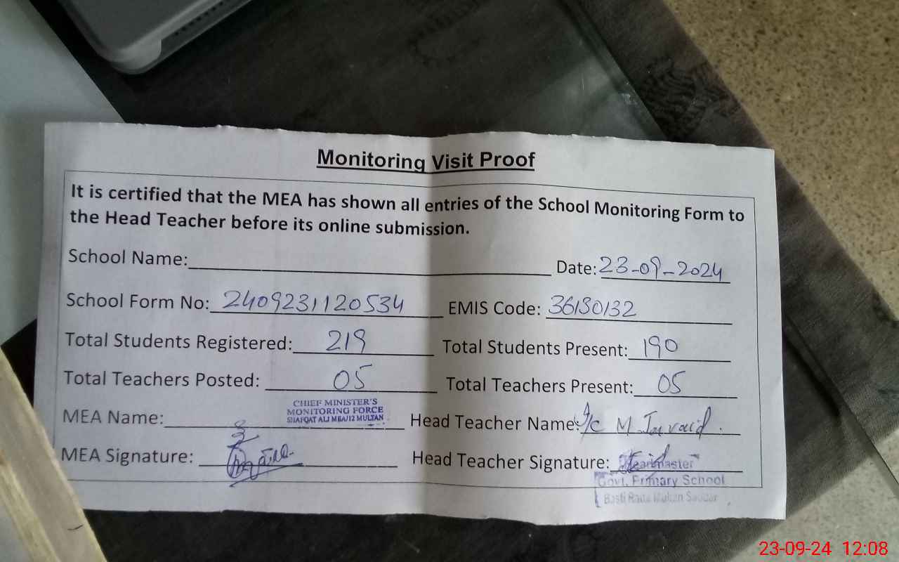 | Attendance Register | Head Teacher | MEA with School | Visit Proof |