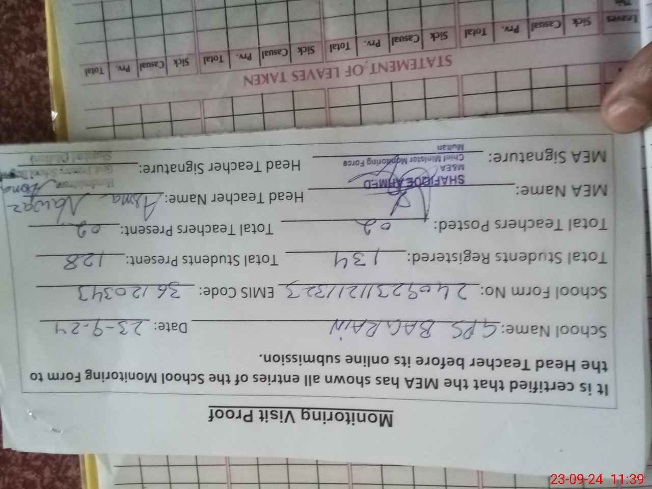 | Attendance Register | Head Teacher | MEA with School | Visit Proof |