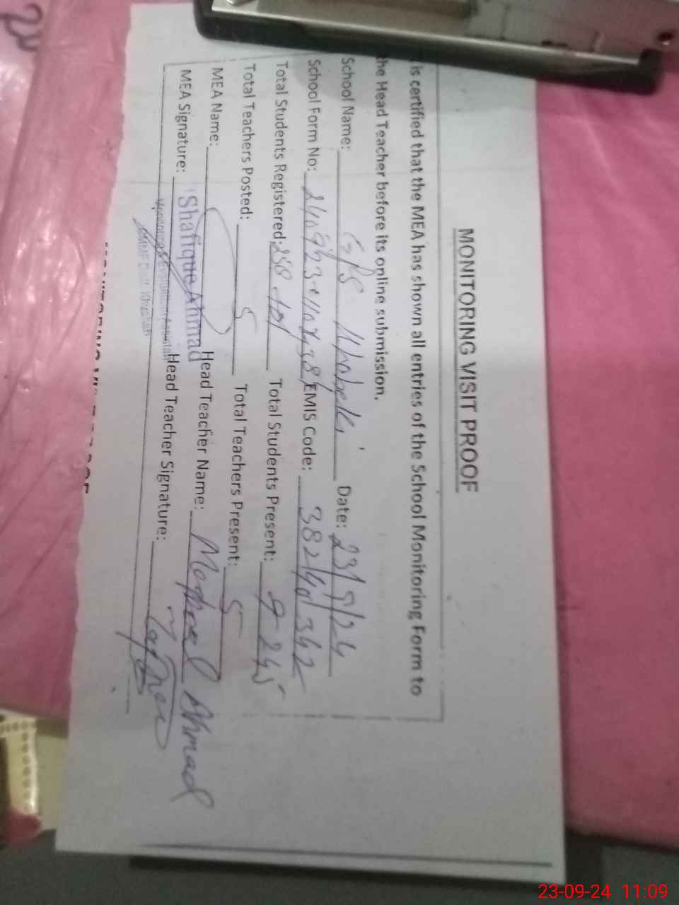 | Attendance Register | Head Teacher | MEA with School | Visit Proof |