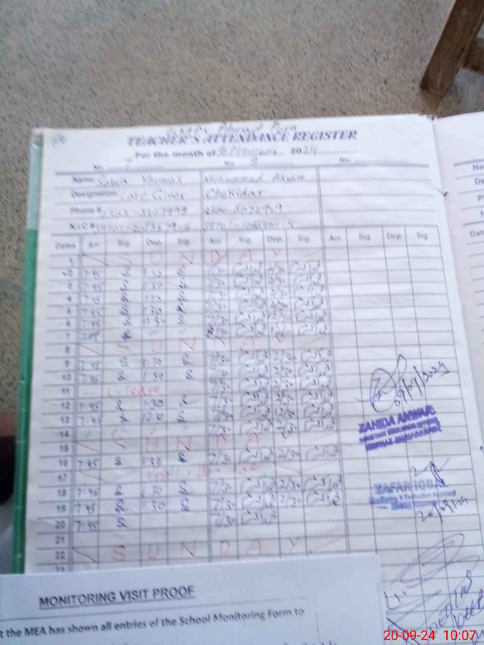 | Attendance Register | Head Teacher | MEA with School | Visit Proof |