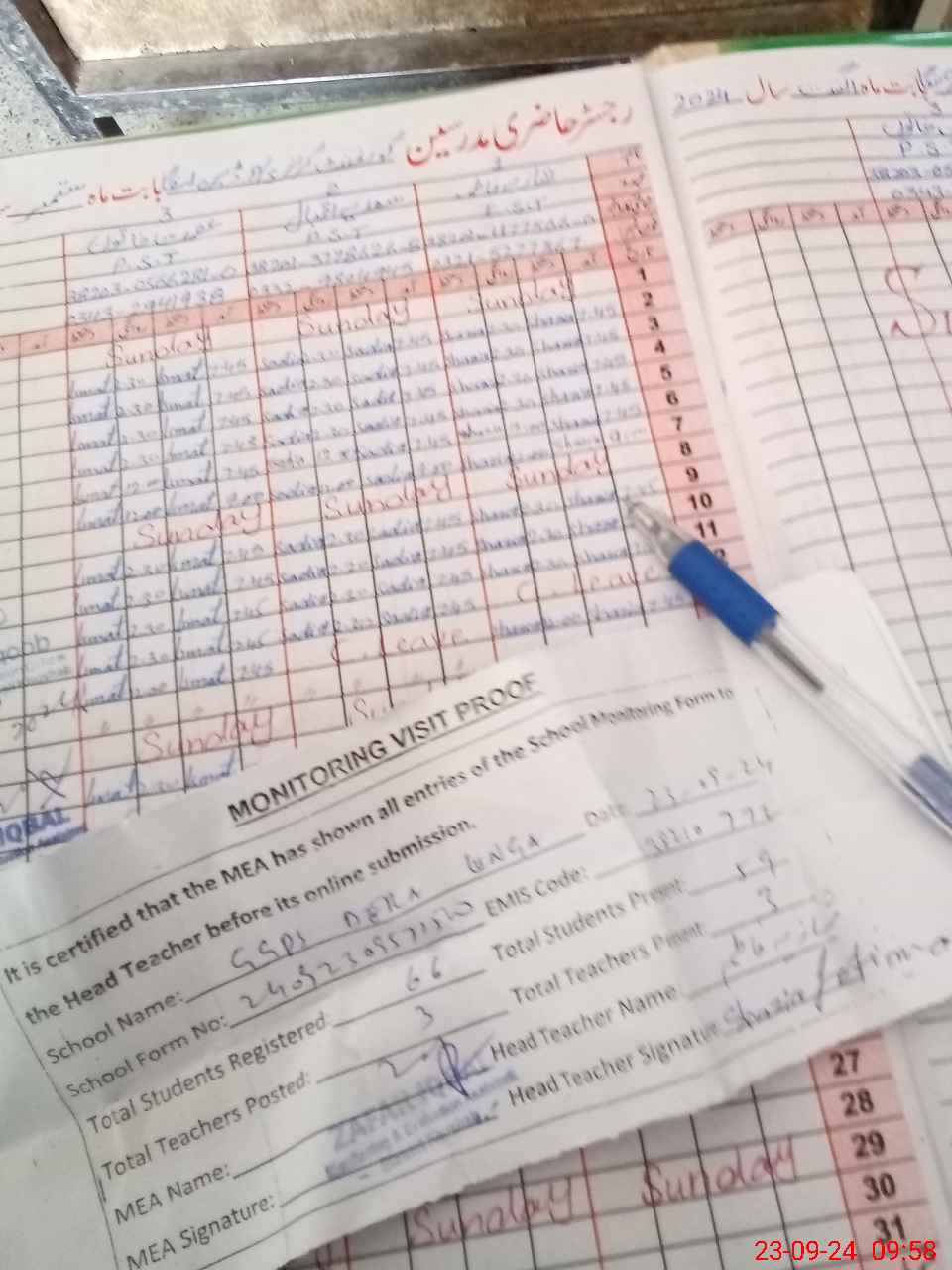 | Attendance Register | Head Teacher | MEA with School | Visit Proof |