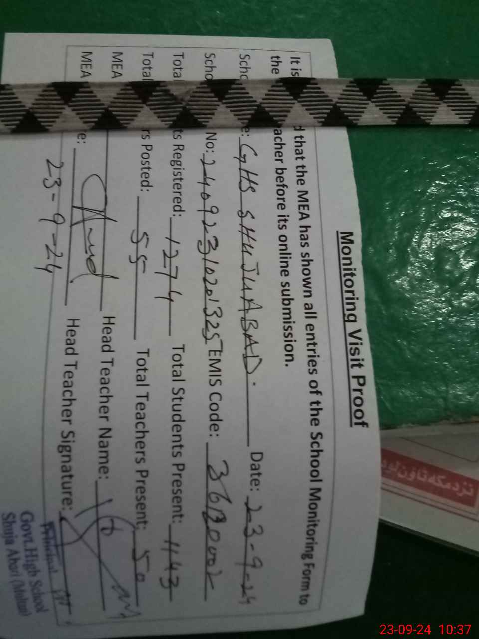 | Attendance Register | Head Teacher | MEA with School | Visit Proof |